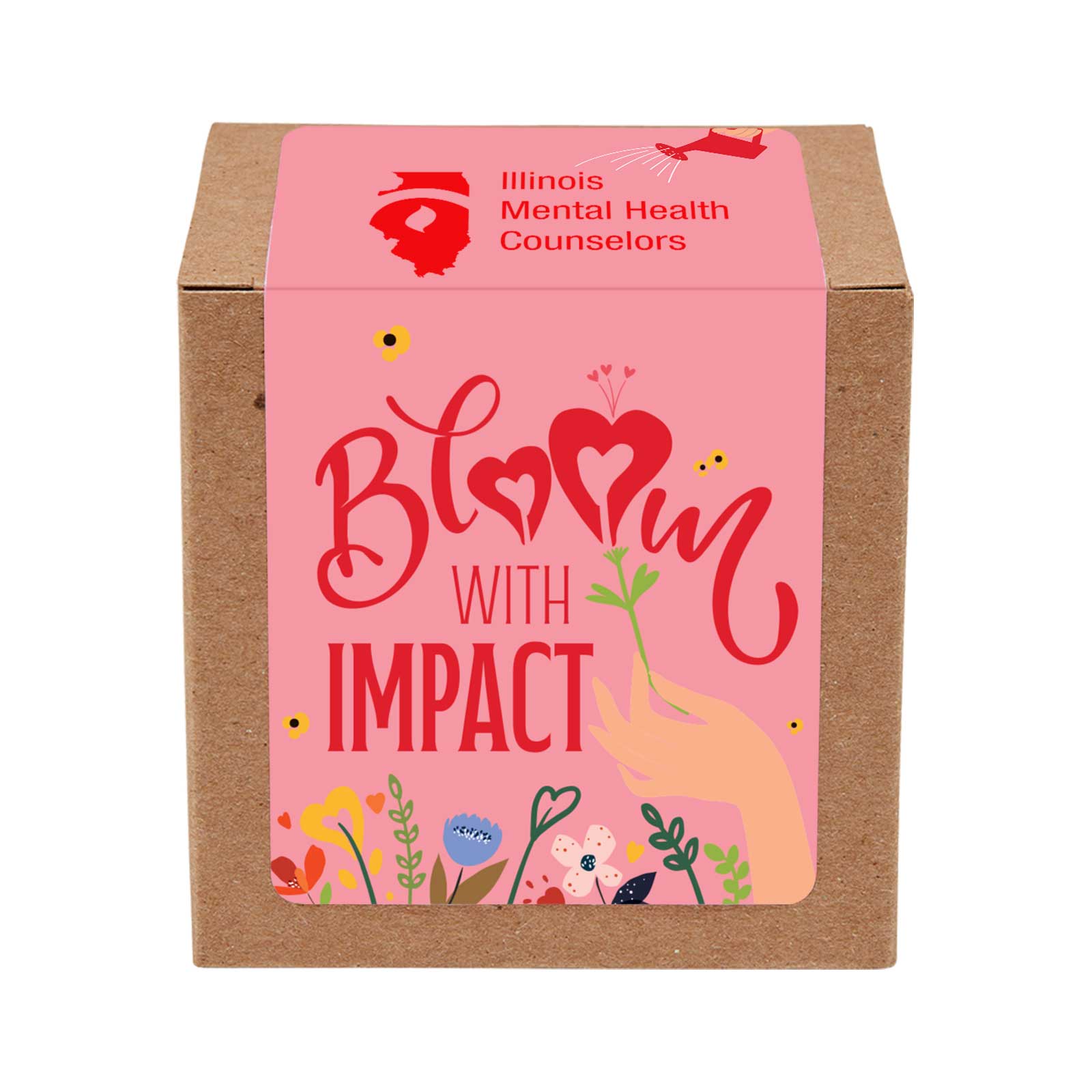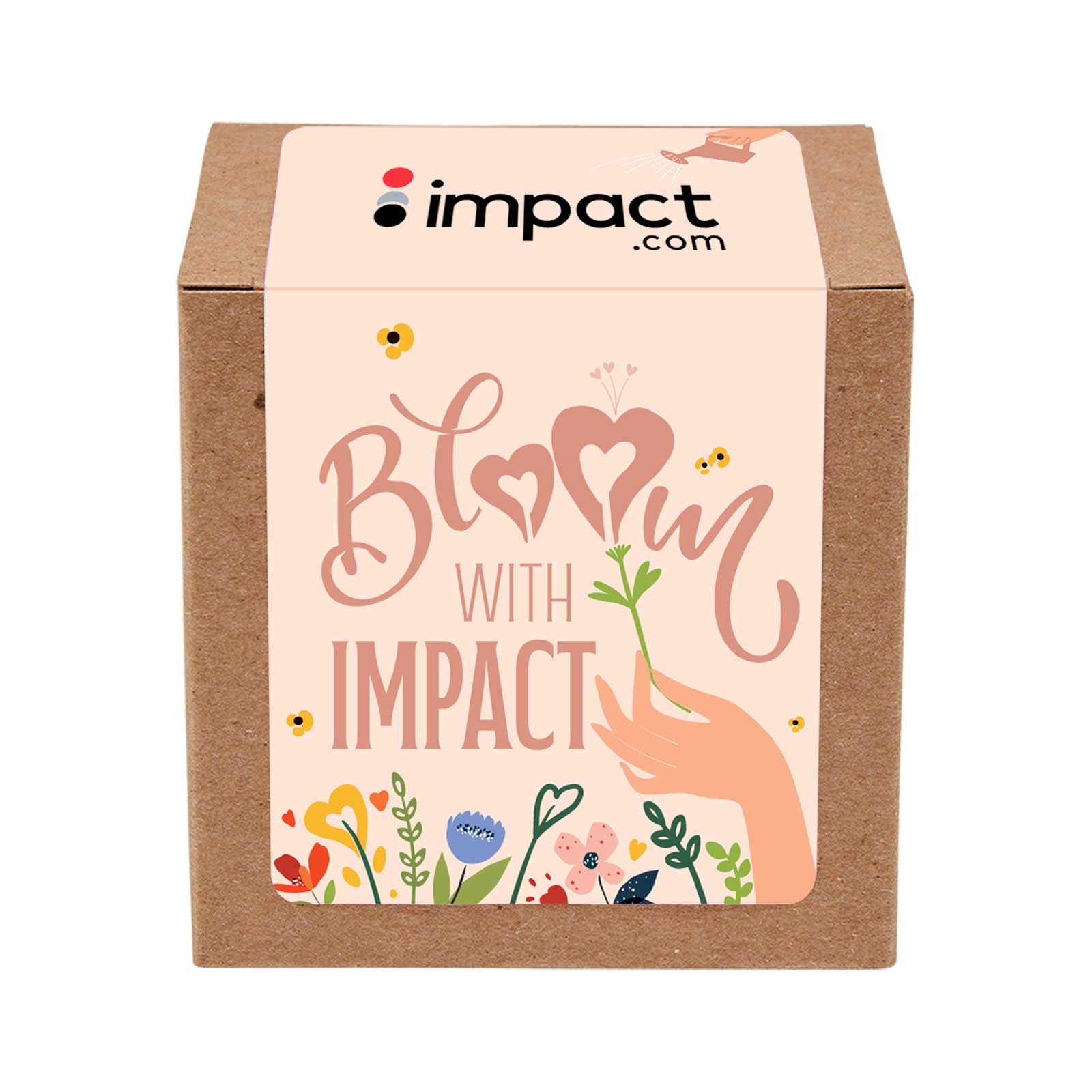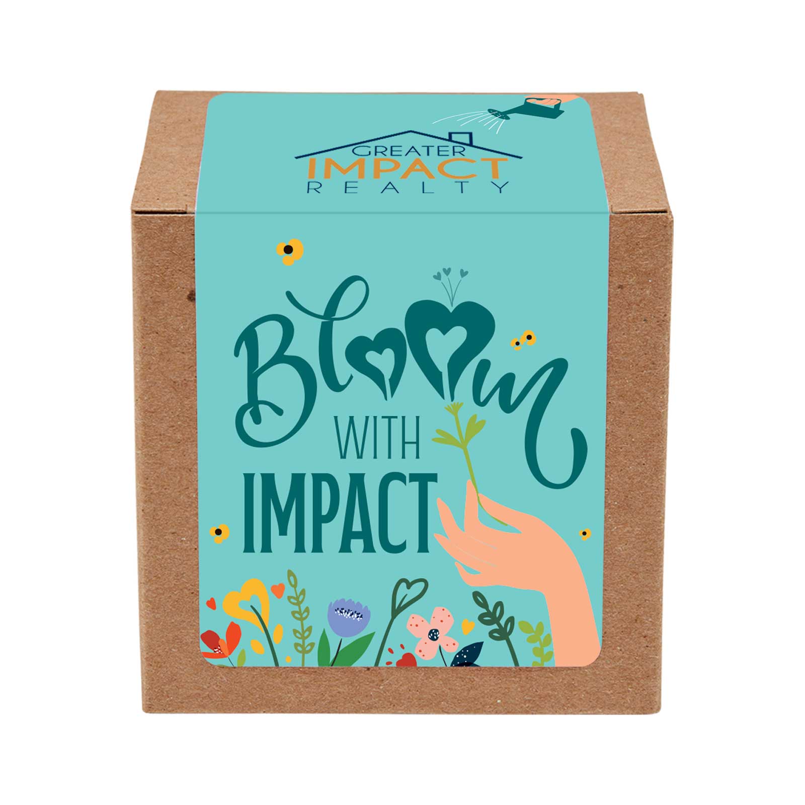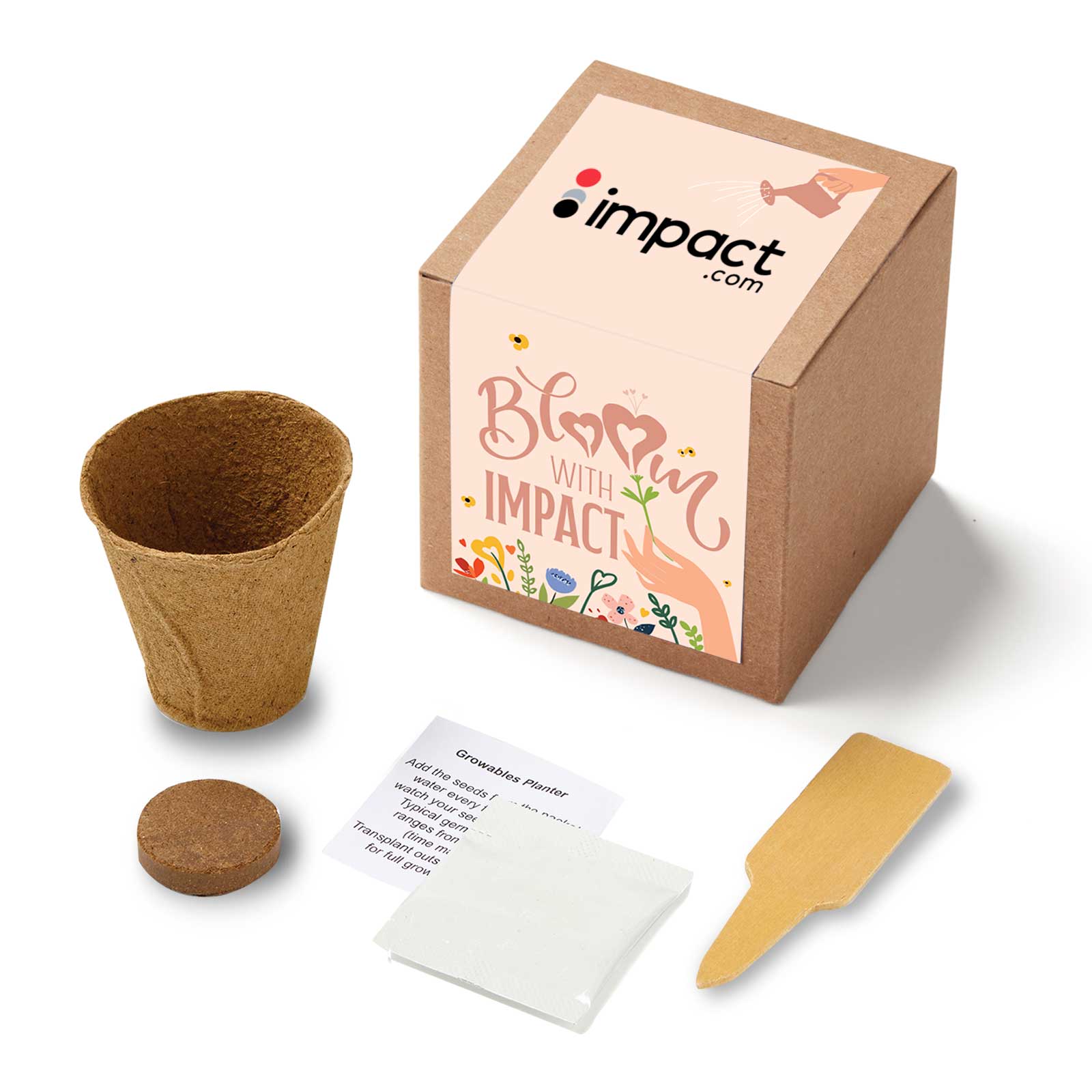 Get more exposure for your brand with this Bloom with Impact Growables planter! A giftable planter that grows more than greenery it grows impact. It's a fertile fiber pot measuring 2 1/4" H x 2 1/2" top dia. that is 100% organic, sustainable, and biodegradable. It's made of spruce wood and manufactured without glue or binders, making it ready to be placed in outside soil. Water, air, and roots will penetrate the walls, meaning there's no need for drainage holes. The natural root structure that develops will help growth. This includes a soil pod, seed packet, wooden stake, and instructions. This germinates in 2-3 weeks and results may vary.