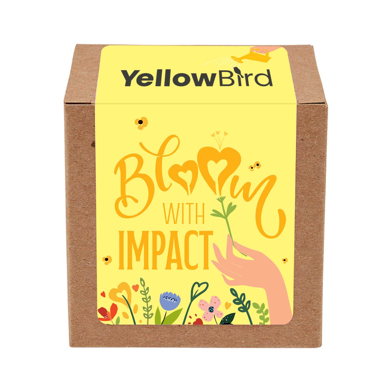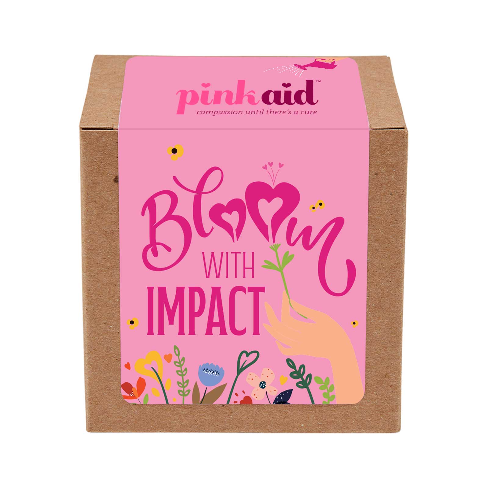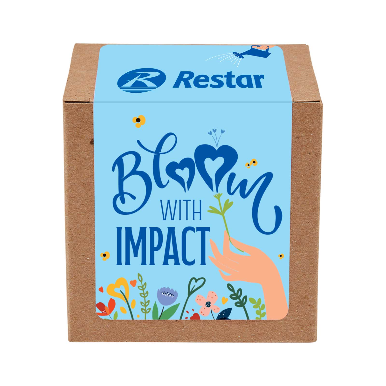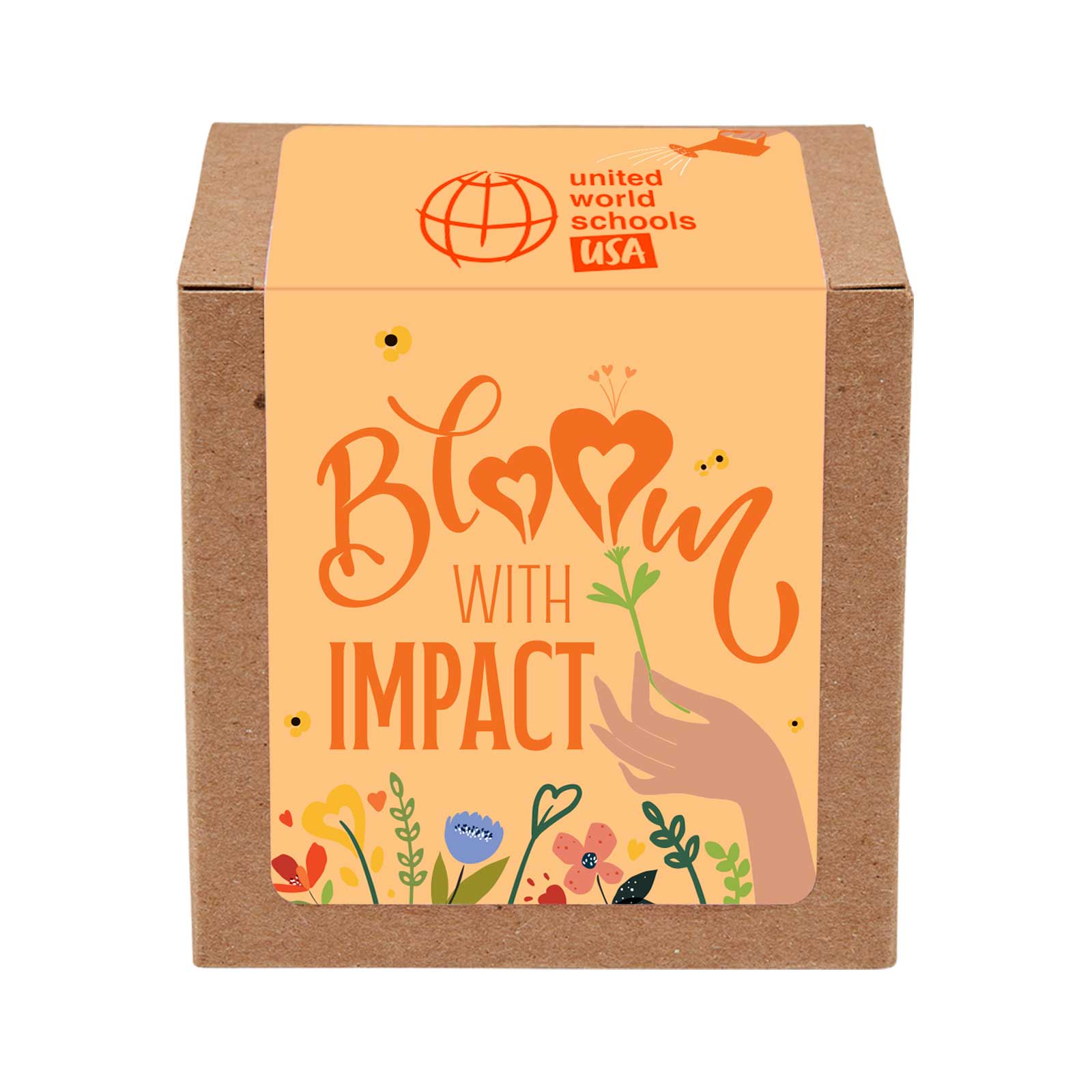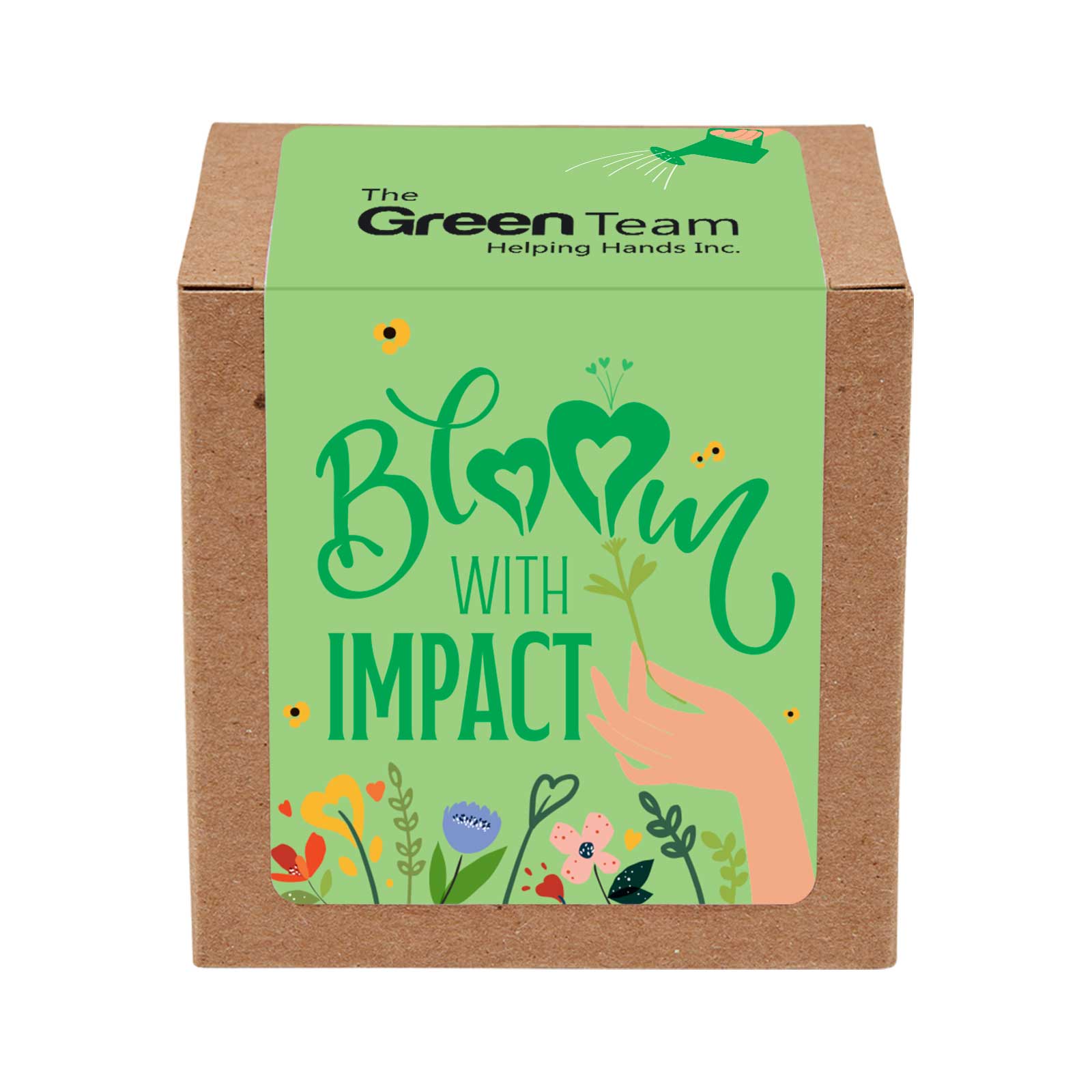 Get more exposure for your brand with this Bloom with Impact Growables planter! A giftable planter that grows more than greenery it grows impact. It's a fertile fiber pot measuring 2 1/4" H x 2 1/2" top dia. that is 100% organic, sustainable, and biodegradable. It's made of spruce wood and manufactured without glue or binders, making it ready to be placed in outside soil. Water, air, and roots will penetrate the walls, meaning there's no need for drainage holes. The natural root structure that develops will help growth. This includes a soil pod, seed packet, wooden stake, and instructions. This germinates in 2-3 weeks and results may vary.