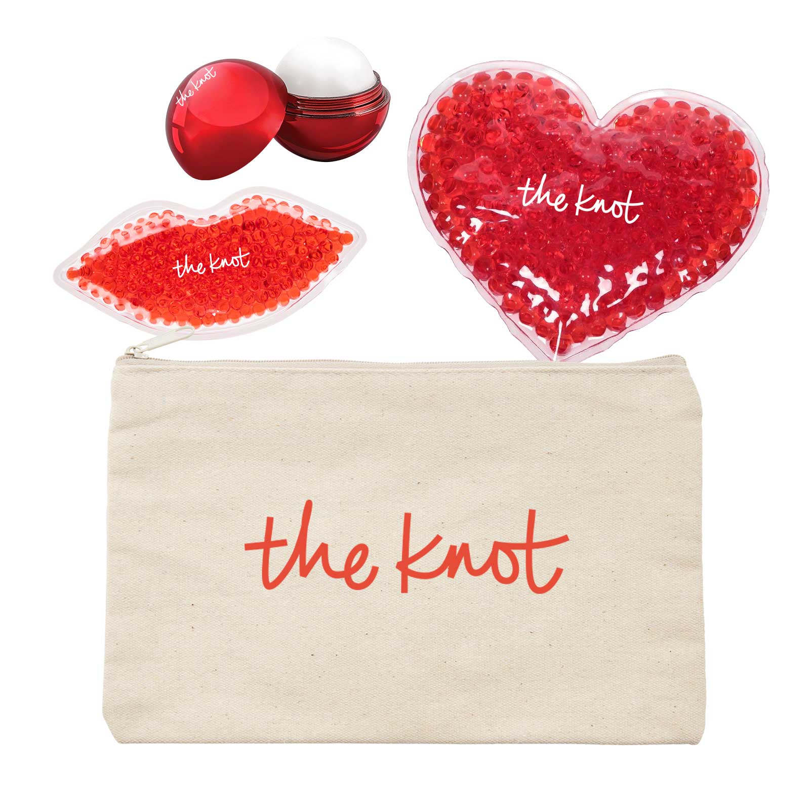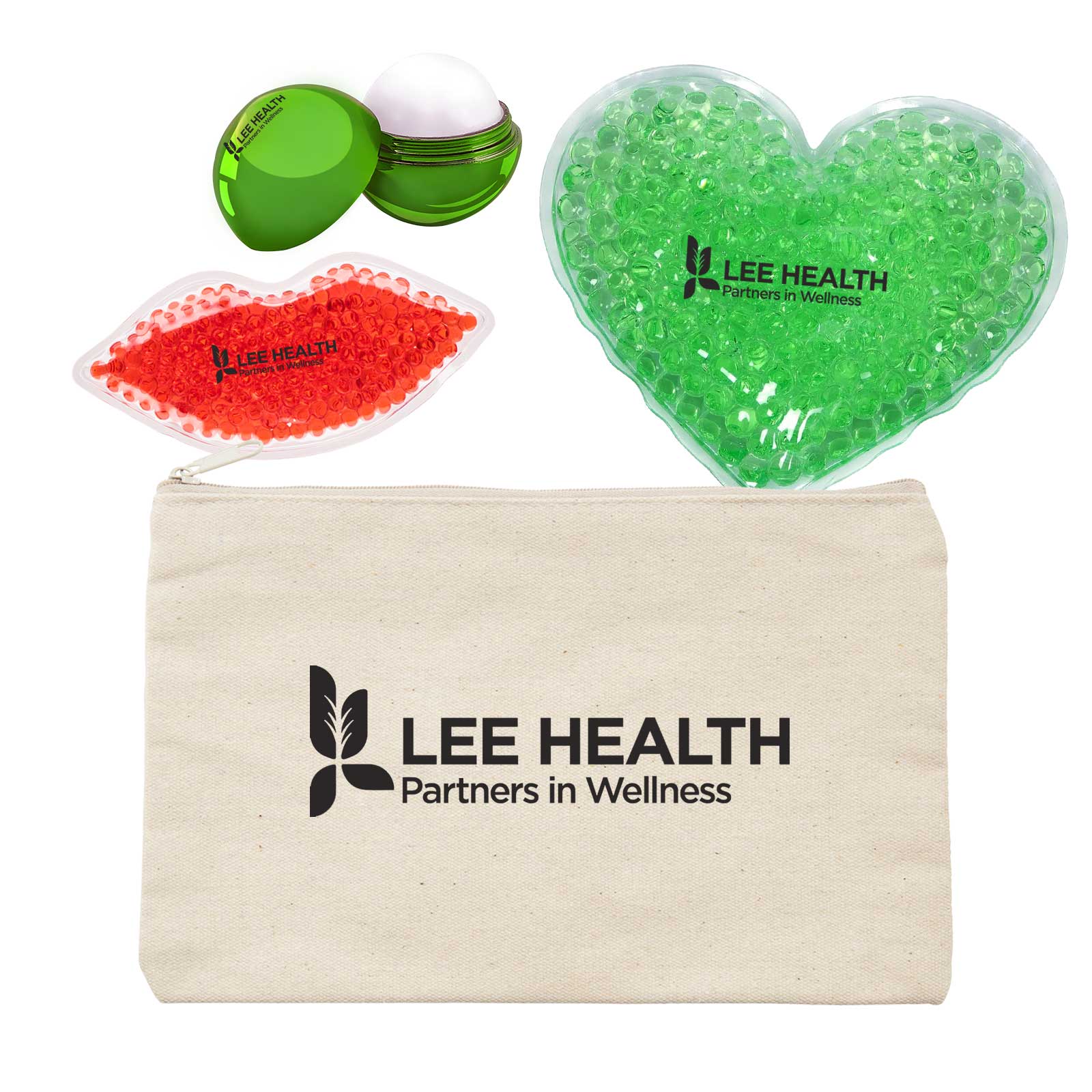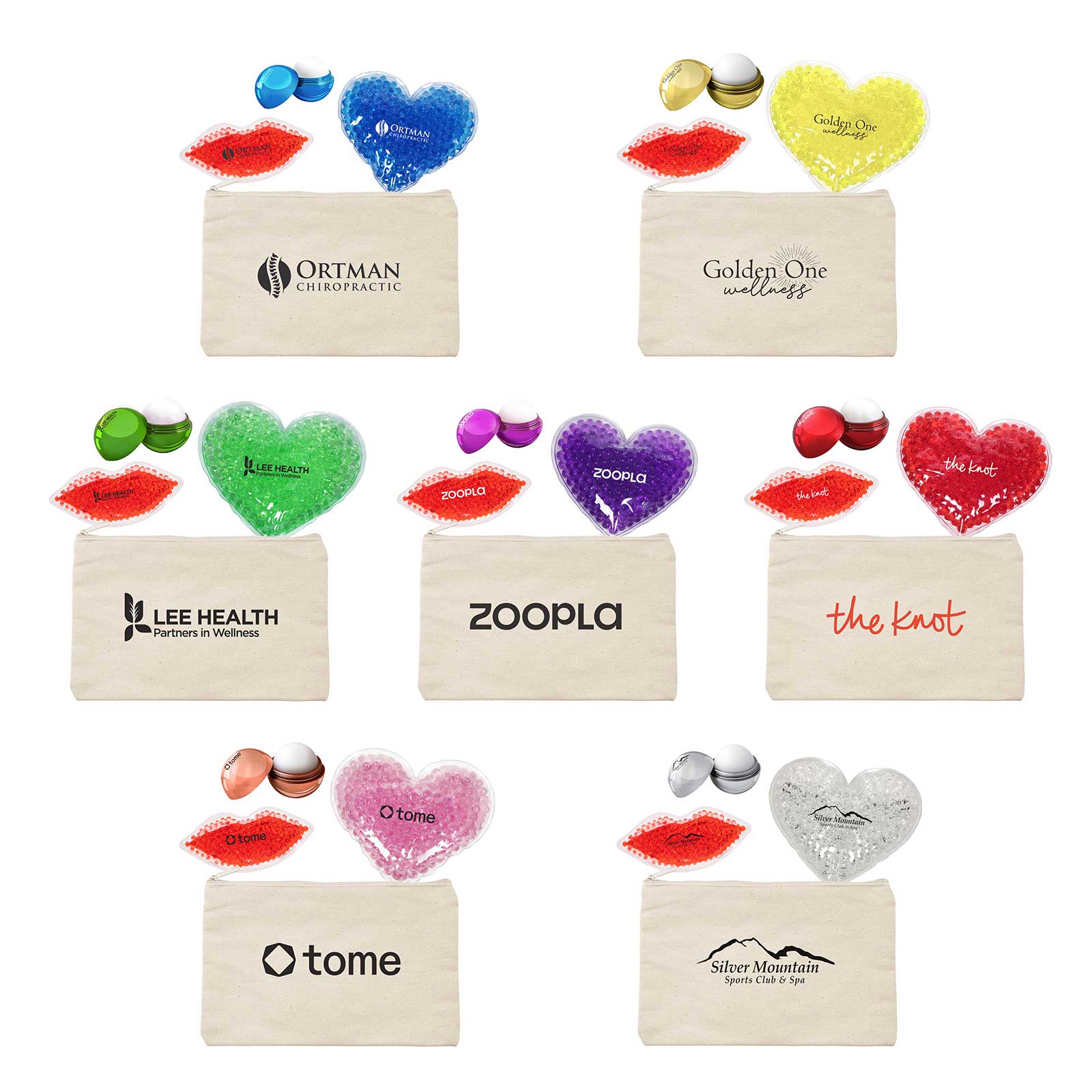 Natural canvas bag with red lip-shaped gel pack, and your choice of lip balm and heart-shaped gel pack colors: blue, green, purple, silver/clear, red, gold/yellow, or rose gold/pink